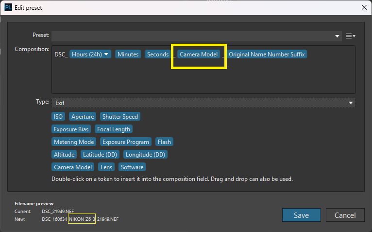I would add aliases for Camera Model so that they are short. For example, instead of the default “NIKON Z6_3”, I would like to enter an abbreviation in the file name, e.g. Z63. I see the possibility here of either predefined 3-character abbreviations for Camera Model or custom aliases.