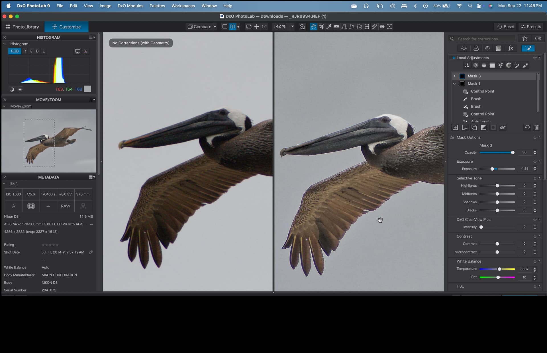 Bird at +0.4 exposure, sky at -1.75 to push it. Original left, edit right to darken sky