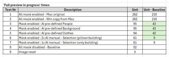 I re-create masks from scratch, where the manual AI masks is very-very same (of course pre-defined masks is the same) - but not the same changes on mask. When all mask enabled, the result is the same: 262 unit. In few cases it was more, but after multiply runs i think its the same. The baseline value is also the same.