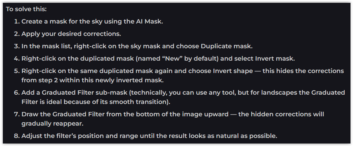 In DxO’s quite specific example, this ‘upside’ Graduated Filter “reflects” the sky’s coloration onto the foreground. – Since this happens within the sameMask, the same tonal corrections are applied (a property of the Mask, so to speak).