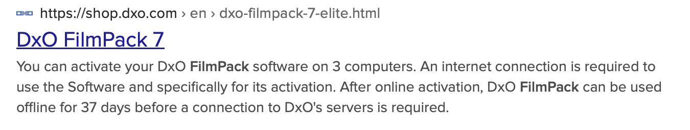 I recently had a horror show experience trying to get a new license code for DxO FilmPack (I’m the only user). I’ve paid for three versions, but DxO’s new position is that you only have a current license and it can only go on two computers (so I couldn’t even install older versions for which theoretically I should have a few authorisations). It took over six messages to finally get a new authorisation out of Riley.