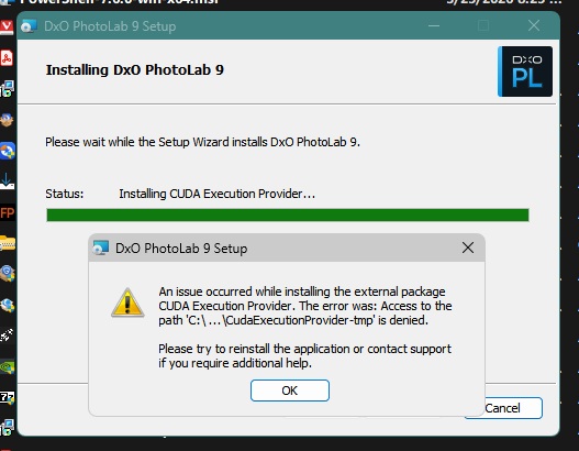 As it’s describe: “Access to the path … is denied”. So, some access is denied. I don’t think its about the DxO PL installer problem. May not correct access right(s), missing rights, some antivirus prevent it, may other running application (like AI stuffs), some Windows Smart control prevent it (Intelligent Application handling), etc. Who knows from that message where and why, its just Windows things on Your System. Try step-by-step to check rights, etc.