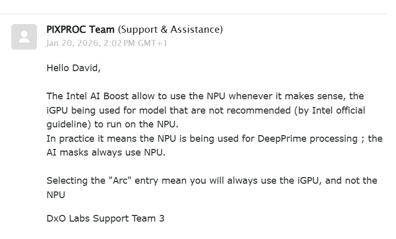 This is what I have been told by DxO with regards these selections - selecting ARC GPU basically ignores the NPU? So Is the NPU really a min spec for Intel Graphics?? I’m not sure.