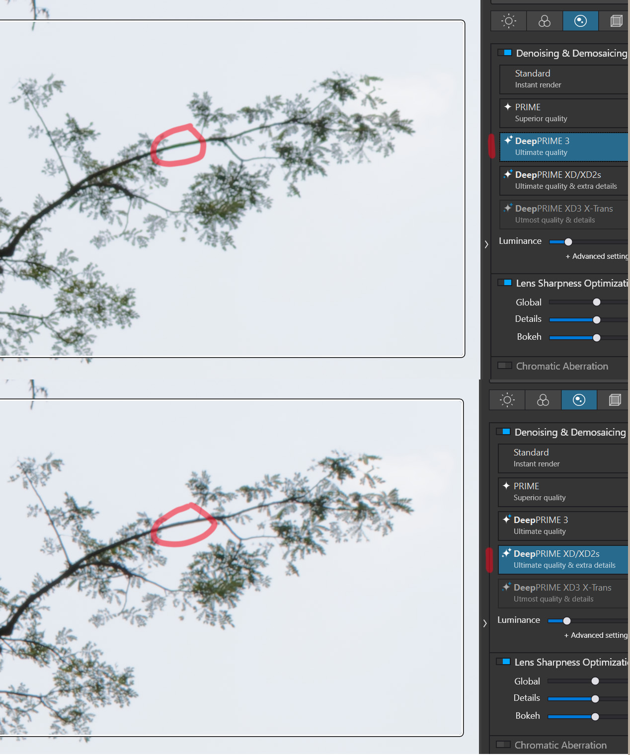 My results aren’t consistent. Here’s an example where DP3 did a worse job on tree branches with strong backlight. And this is with a good lens (Sony 35mmGM).