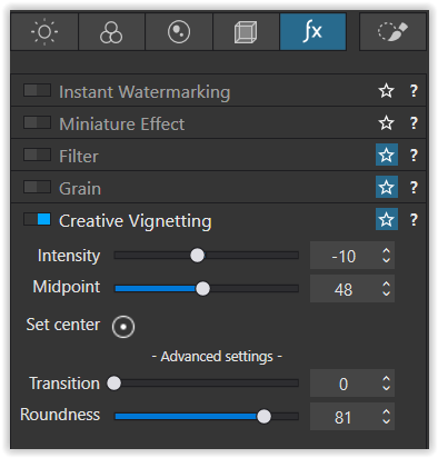 Creative vignetting can be used if you have a FilmPack license activated in PL. Otherwise it doesnât exist.