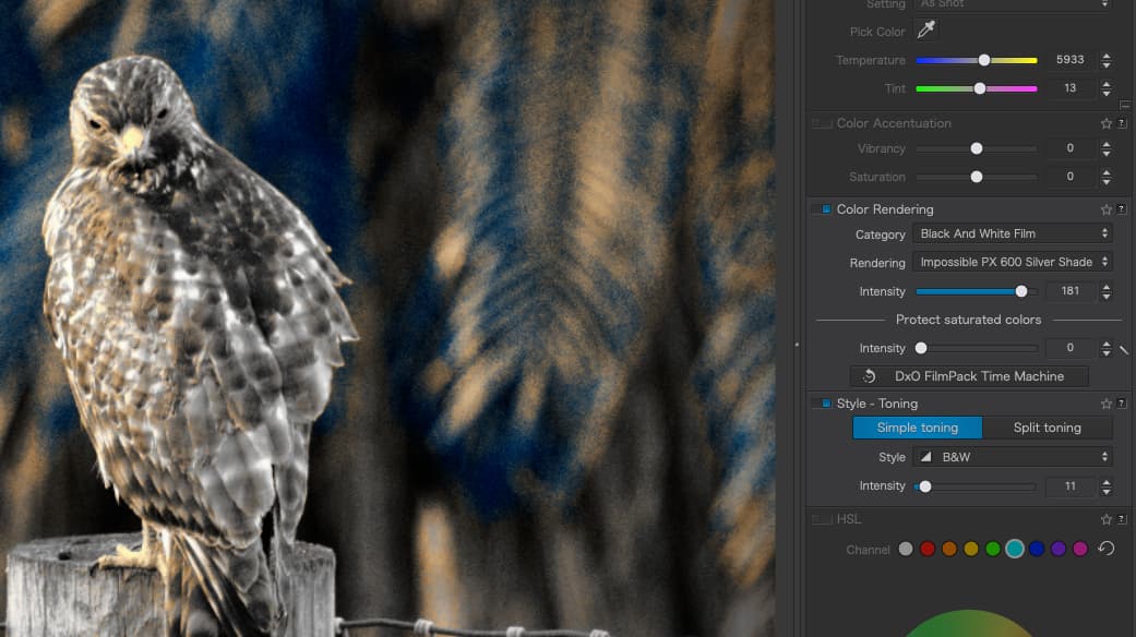 What in the world is “Impossible PX 600 Silver Shade”??? I left the “intensity” at 100, but where did the color come from? It makes the photo look very fake, like a stuffed bird on a post in front of a strange background. If indeed this is a B&W film, I can’t come up with any explanation…