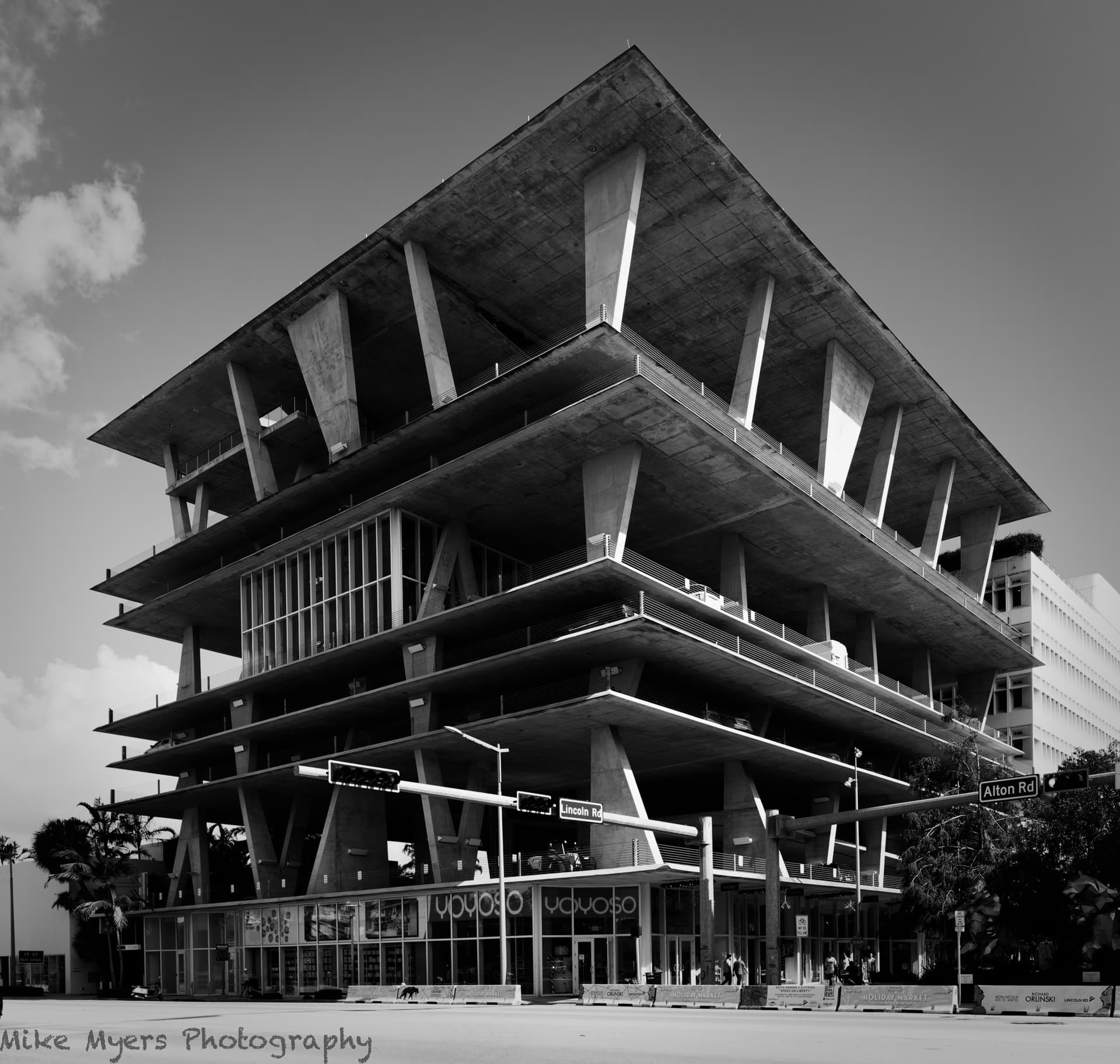 There is a now famous parking garage in Miami Beach, that I have been trying to photograph for years. There is only one spot I know of where I can capture the whole building, and now I’ve got my 20mm lens I could get the view I wanted. It’s certainly not a “journalistic” photograph, as it breaks their rules. I liked it in color, but I like it more in B&W as that puts all the emphasis on the shapes. I hope I cropped it in a way that emphasizes the building. I had to play with the tones, so the histogram looked acceptable, no warnings about exposure. Timing was another problem, as there is so much traffic on this street, I couldn’t exclude it long enough to capture my image - after a while, I had my opportunity. I hope the detail and shapes up above keep people from looking at the boring detail on the ground floor.