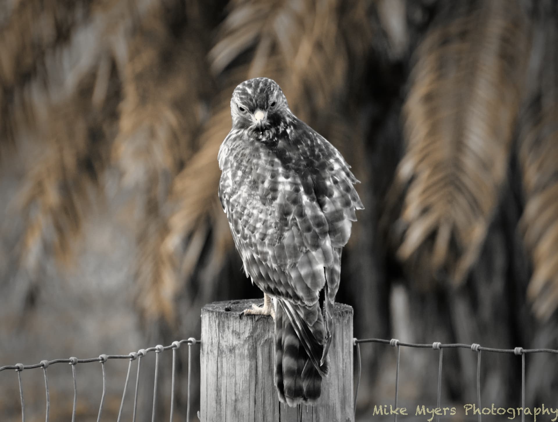 I wanted to try this again, and went back to last winter when I photographed a hawk on a post at my brother’s home. I finally got something I liked. On a whim, I went to convert it to B&W, and started clicking on films, one after another. I stopped here.