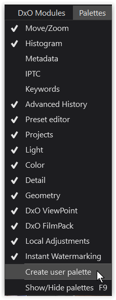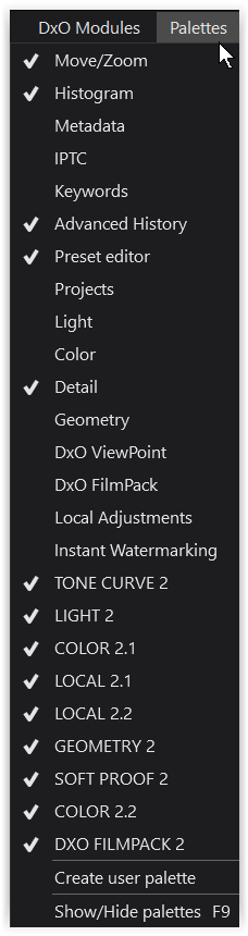 By creating custom palettes and saving the workspace, individual configs can be defined, they can contain palettes of any kind…so maybe this is the best approach until the issue (if present indeed) is solved with the help of DxO.