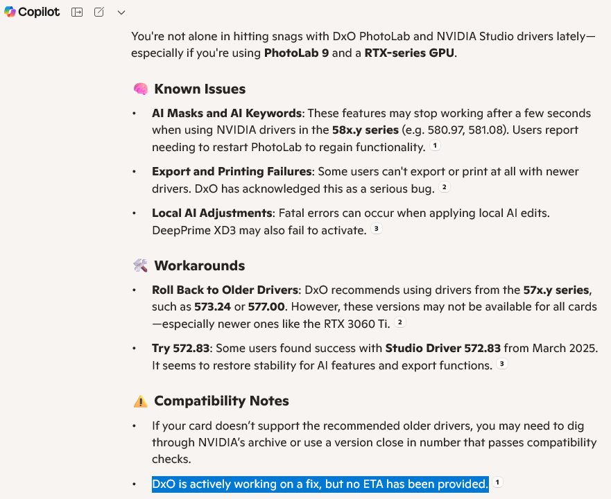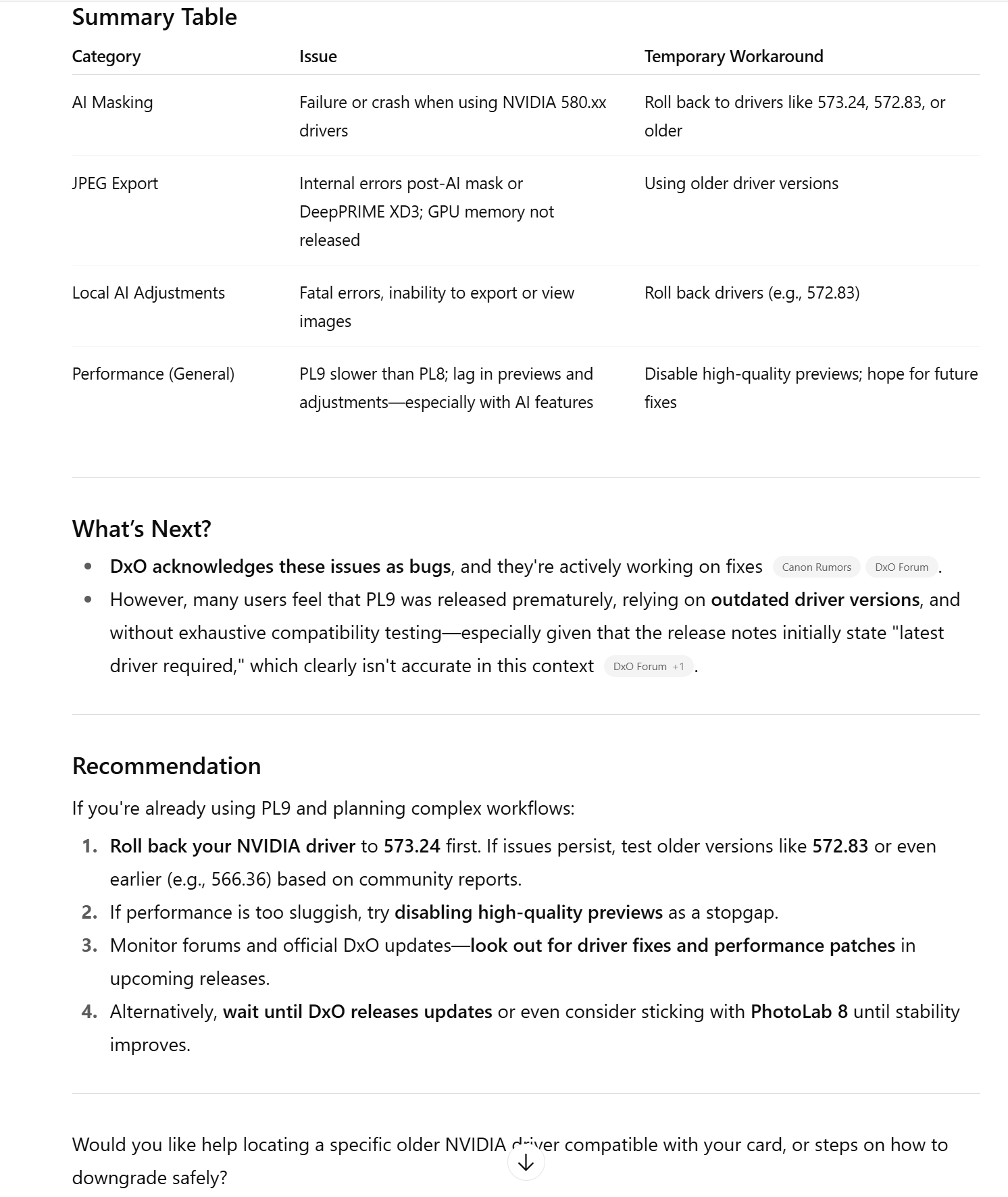 Not just Topaz Labs, but many other companies’ tech support people, probably including DxO, upon seeing in a log file attached to a bug report that you were using video card drivers that were 5+ months old, would make updating the video card driver a very high priority on their list of things to try. And with good reason, as it often resolves problems. So unless many other people upgrading to PhotoLab 9 with current-version nVidia drivers aren’t having any of these problems, which I am not seeing here, I’m going to suggest somebody at DxO dropped the ball.