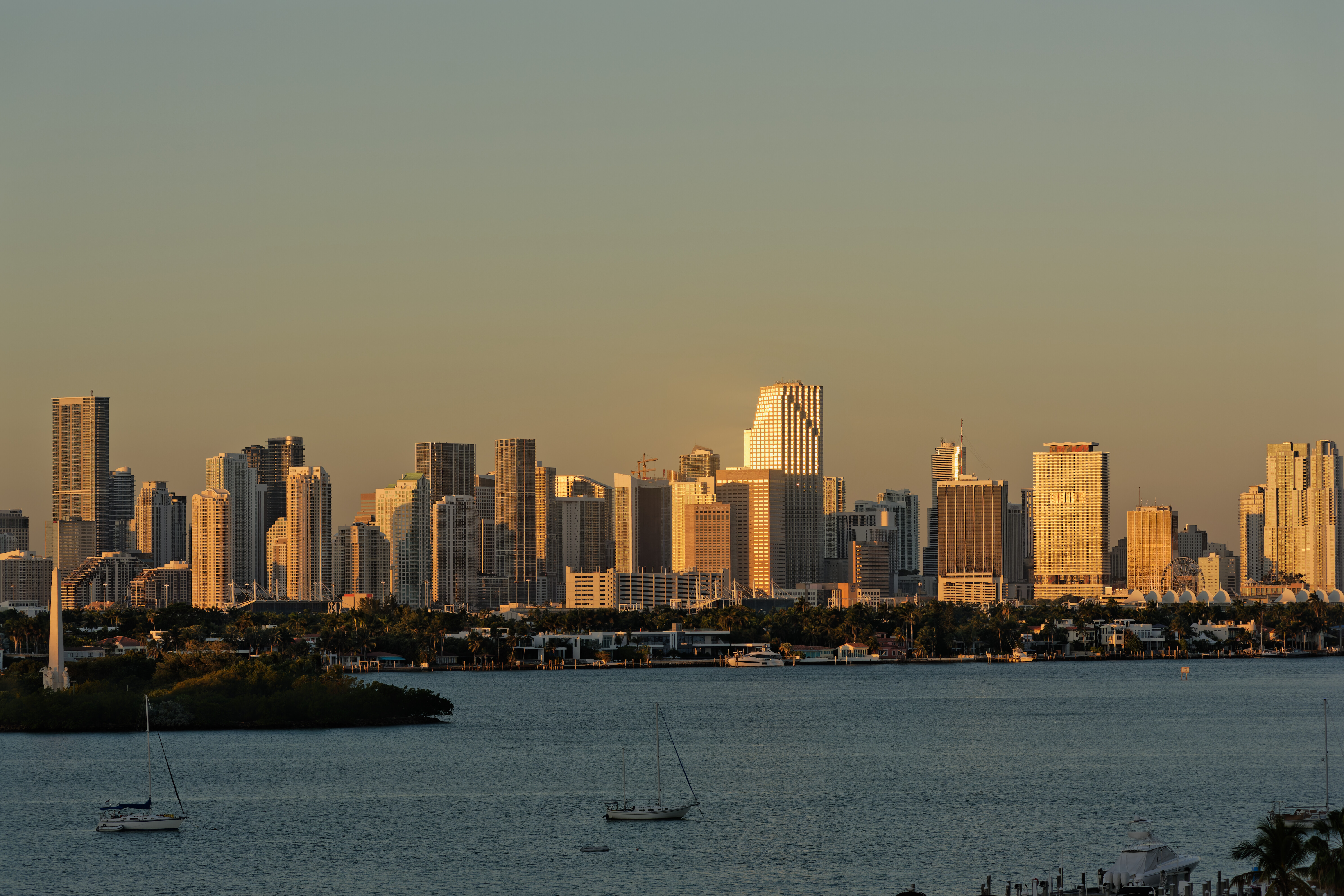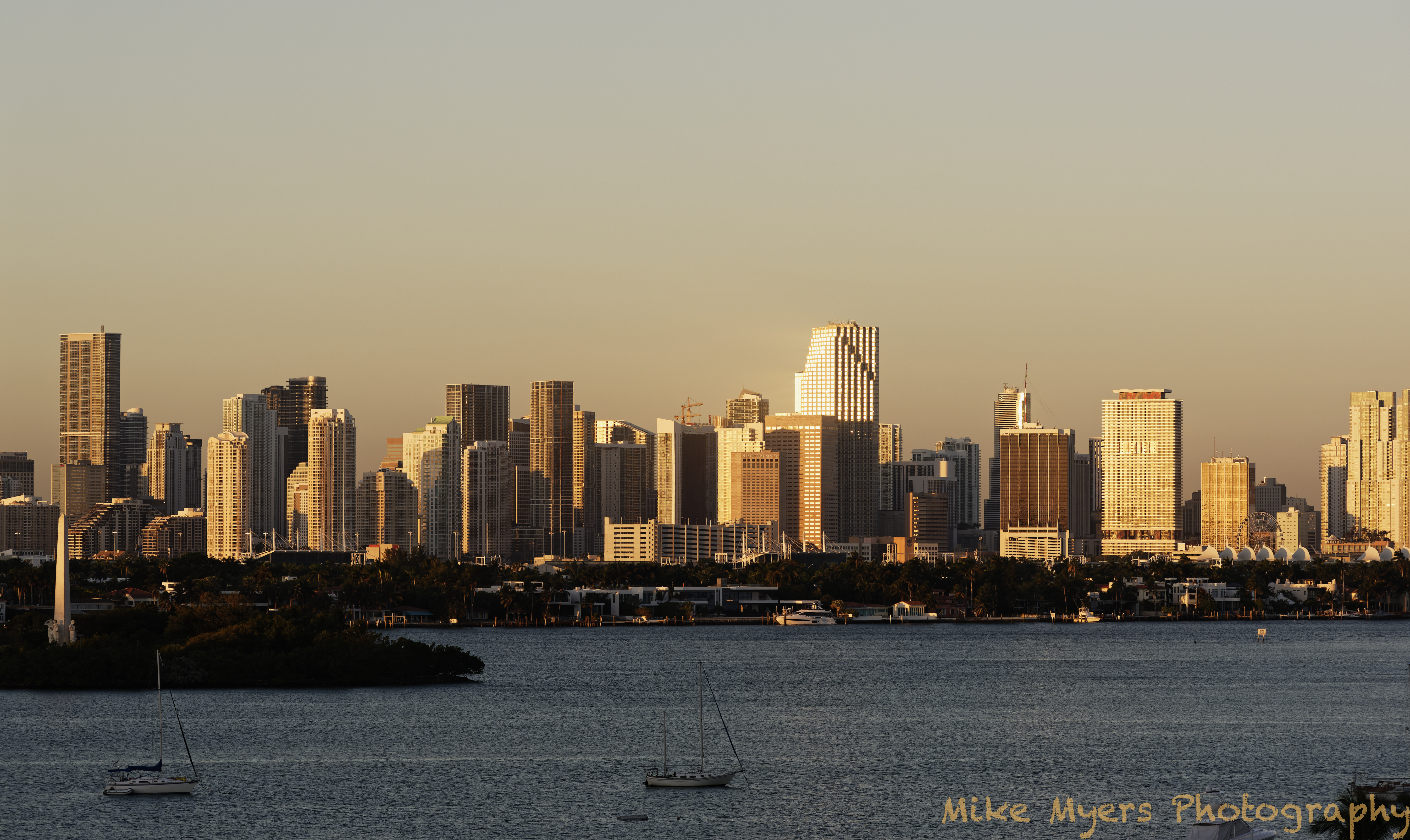 I said I would try to catch the golden lighting of sunrise, and I got my chance this morning. I got up a little before 7, and while it was sort of light outside, the sun hadn’t gotten high enough to light up the city of Miami. I took a series of photos when the sunlight just reached the buildings, but I wasn’t satisfied. Out of 25 images, this one is the only one that caught “the magic”. If you check the tower on the island, the sun wasn’t high enough yet for the sunlight to reach the bottom of the tower, and in the city, the boats have just started to be lit up by the sunlight.