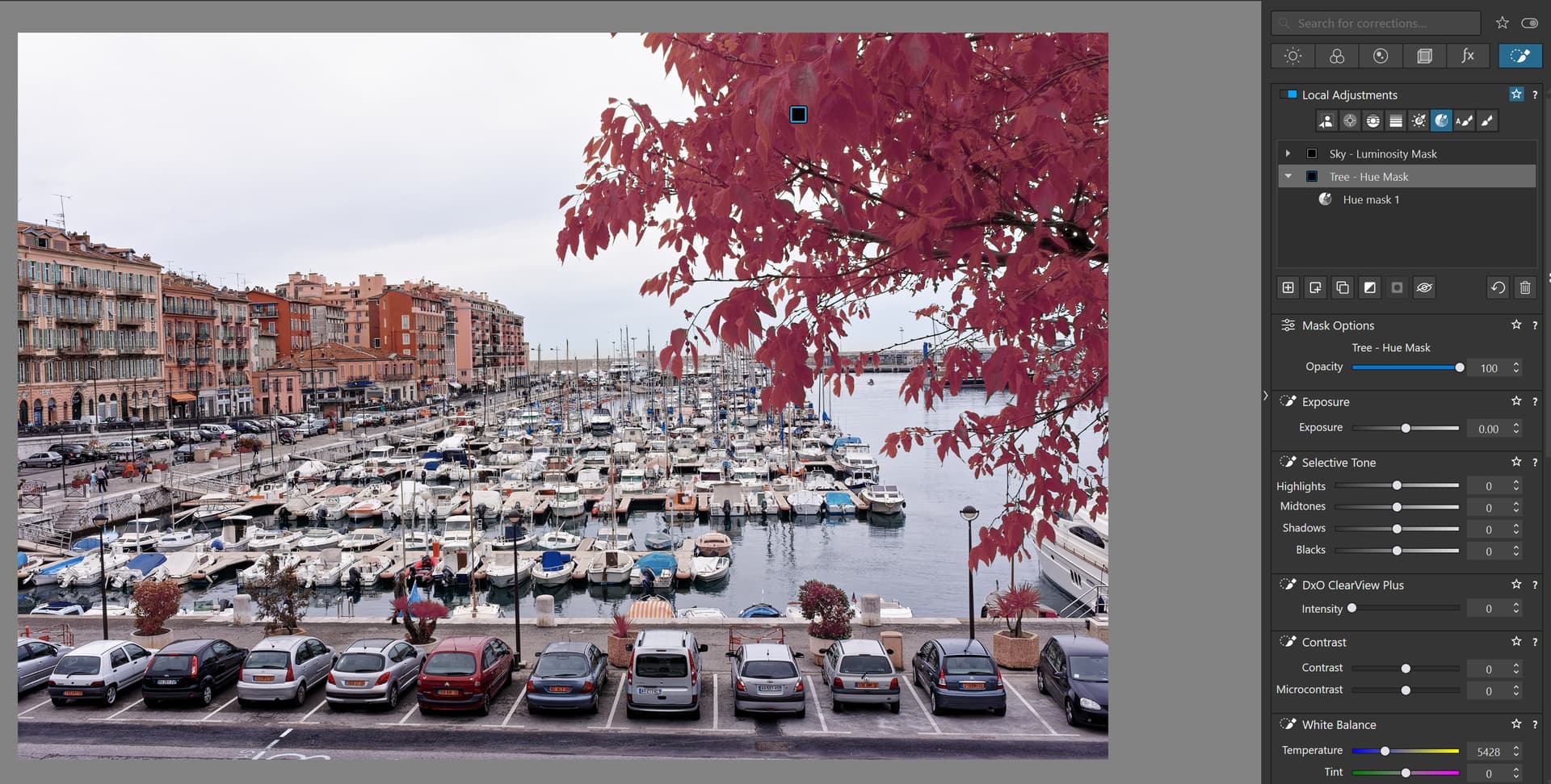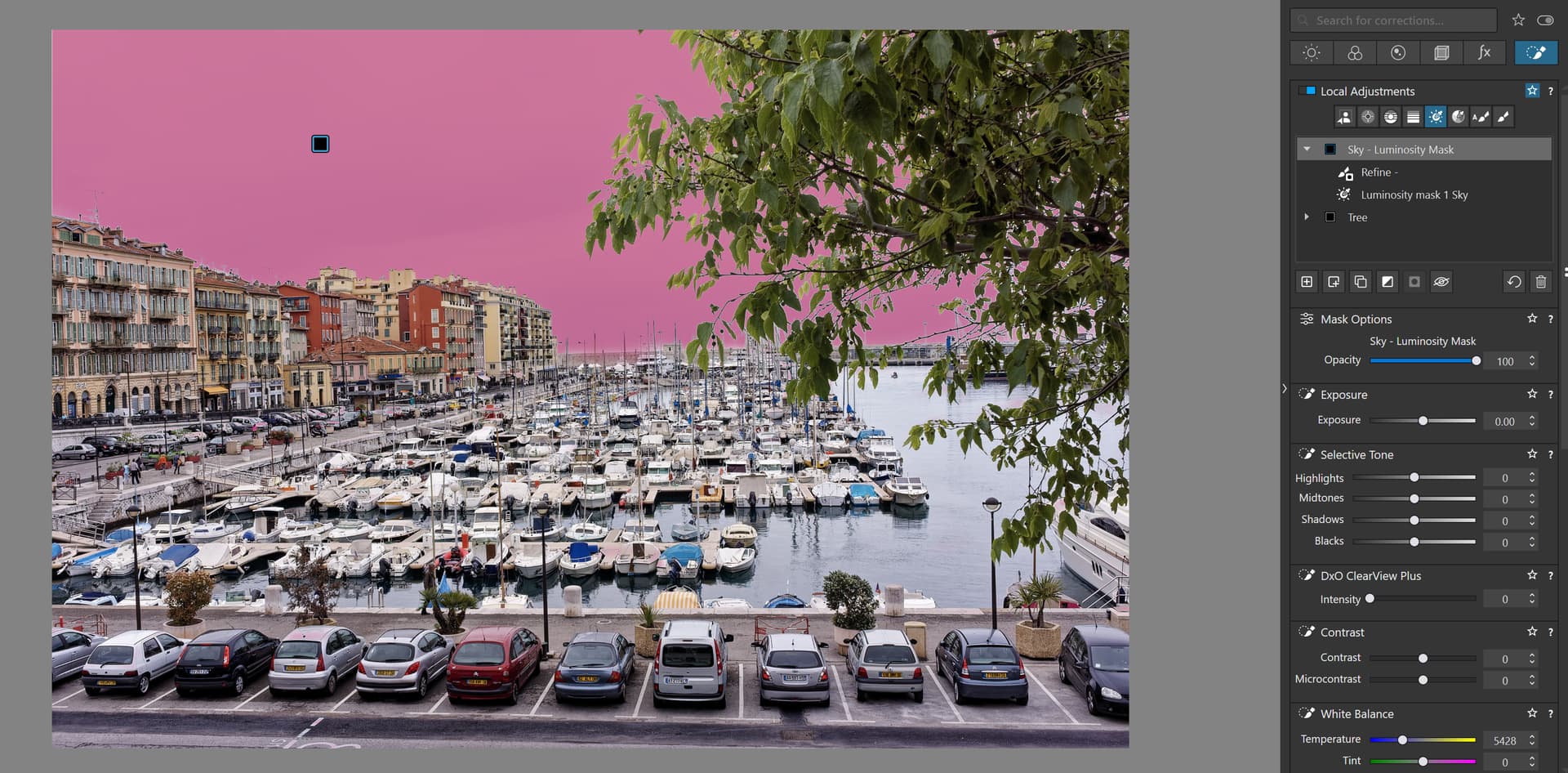 In this case I have instead of using AI-masking (Sky) that by the way do not fix the disturbing tree used a Luminosity Mask for the Sky. Since that even spills over the boats and some cars I have refined it with Local Brush holding down Alt which gives us a very sensitive Erase Tool.