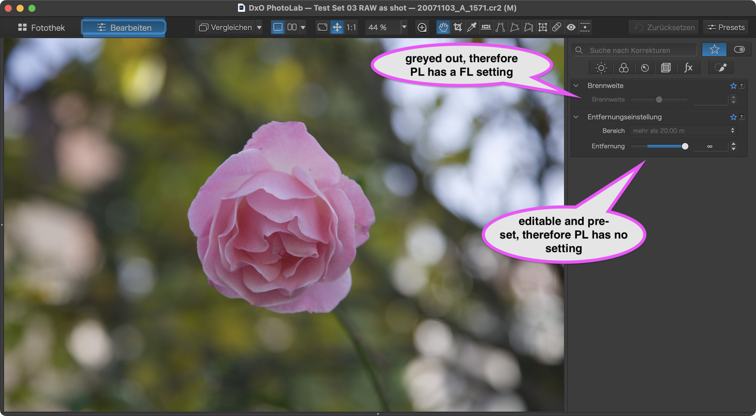 While PL allows FD to be set when FD isn’t reported by the file, RP seems to have no such provision. This can lead to less than optimal corrections of optical flaws. DxO’s default correction settings prevent worst possible results though.