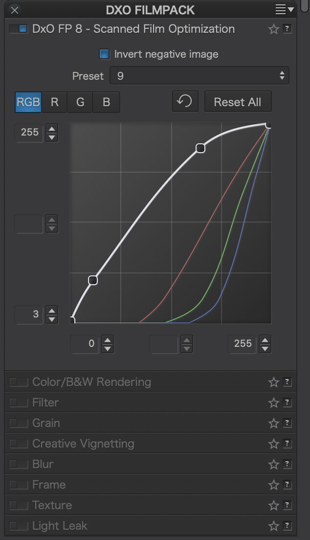 There is something a little weird — and limiting — though. Turning on the Scanned Film Optimisation block disables two things; as if it is then being treated as an RGB image.