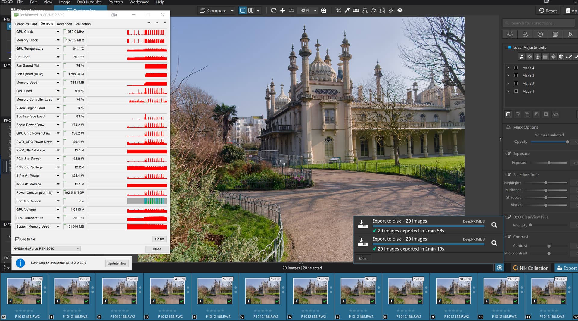 @Allan Thank you for taking the task as seriously as you have. I actually used my 2060(6GB) yesterday and successfully handled the images from my Autumn colour trip and with all NR deselected I was able to set a new mask on an image but as soon as I tried to do an export it all came unravelled and every export failed.