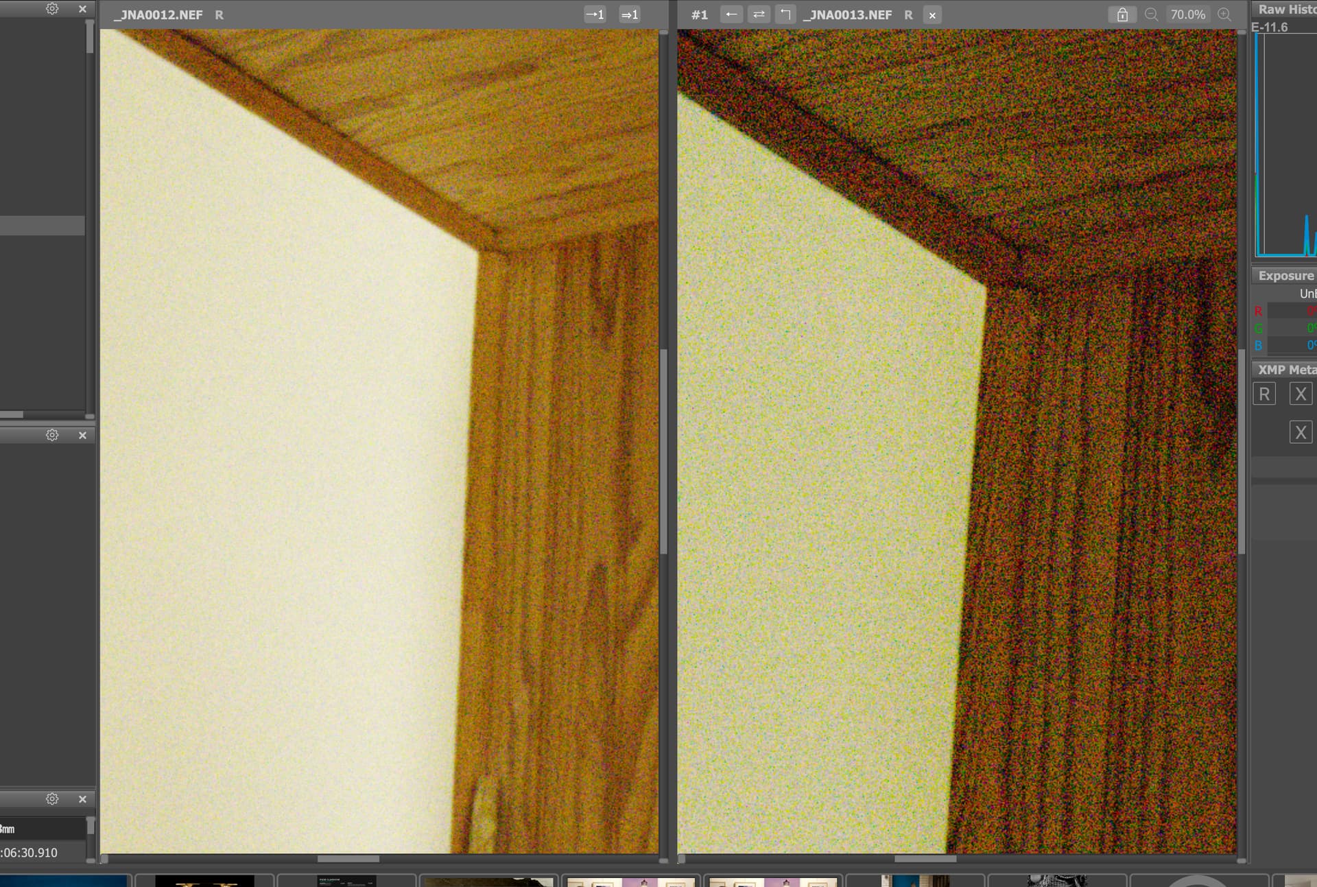 Both parts are taken at 1/500 sec @ f/5. The left one is taken at 25,600 ISO. The right one is taken at 100 ISO and then the exposure slider in FRV was increased to +8EV to give the equivalent exposure.