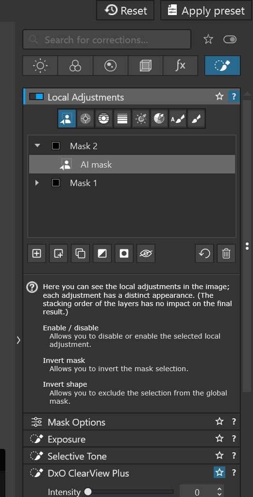 I am trying to make an ai selection using PL9.2. I select the ai widget but I cannot get PL9 to offer a selection widget. The image below is from a youtube video. The green circle indicates the add a selection tool. My copy of PL9.2 does not show the add or subtract selection widget. See the snip showing the local adjustment gui.