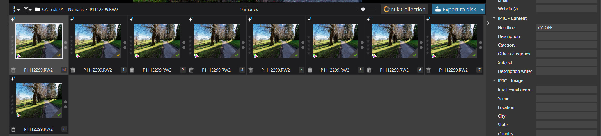 I “hijacked” the IPTC “Headline” field to annotate the test variants.