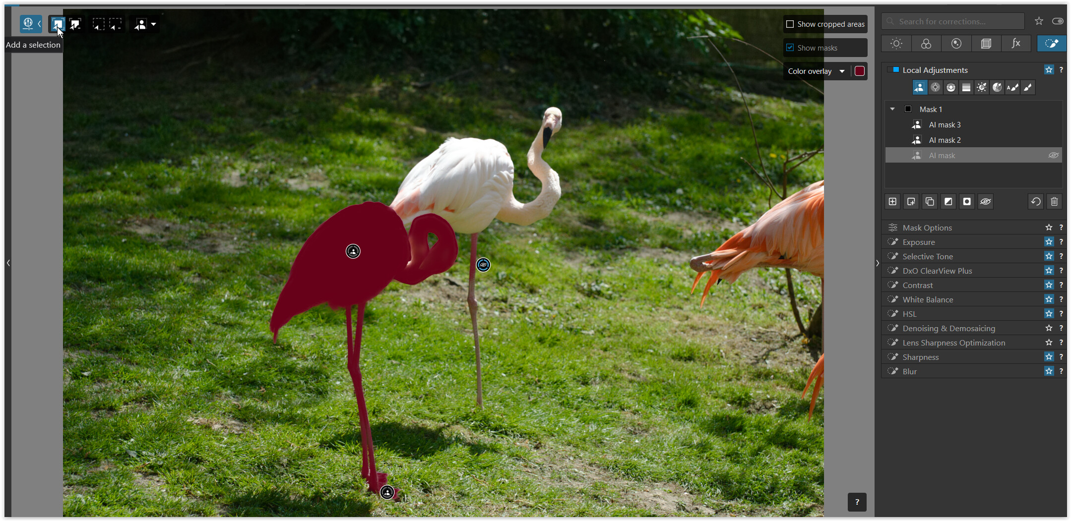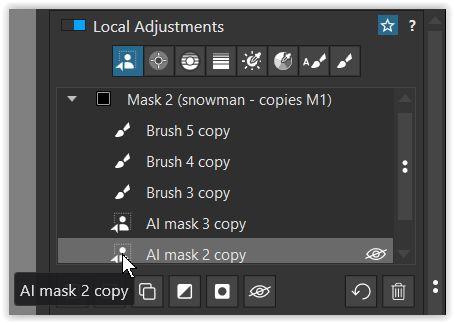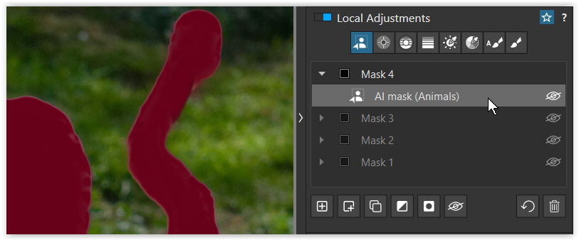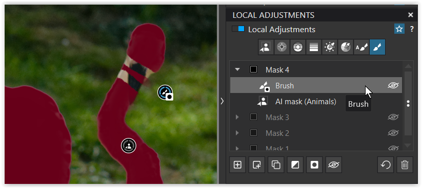 then manipulated by adding a Sub mask, choosing the Brush and holding/pressing ALT to remove from the AI selection → you get a separate mask / easy to correct.