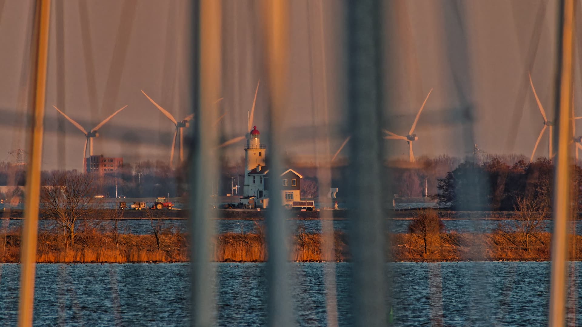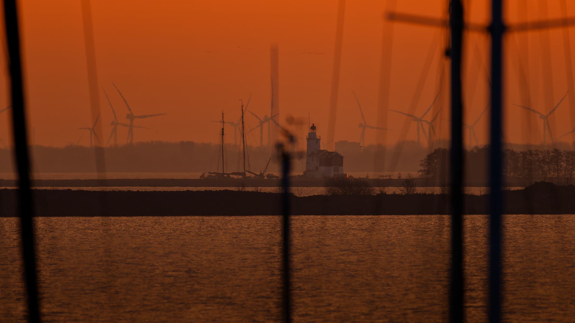 The lighthouse of Marken, Netherlands, taken from a distance of 6 kilometers. The vertical lines are ship’s masts.