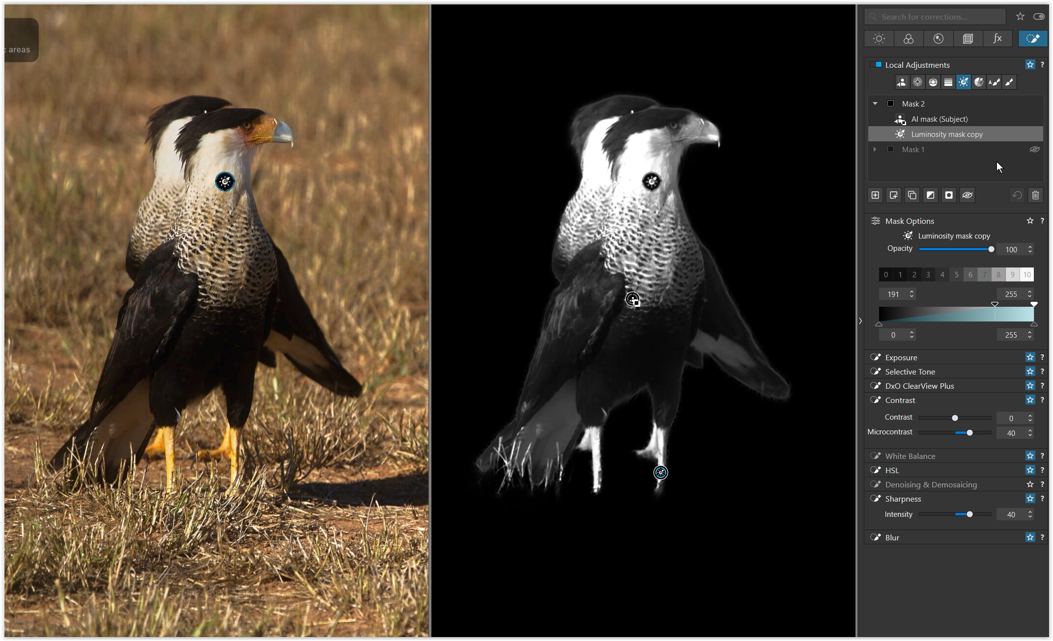 Here’s a quick rough example image where I would like to apply graduated contrast and sharpening to just the bright parts of the birds based on luminosity. This includes the chest, bill, and legs.