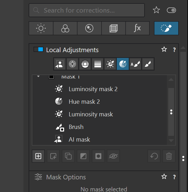 This following shows an example of a complex mask containing an AI mask, a Brush mask, two luminosity masks and a Hue mask. This is by default called Mask 1, but it can be renamed. You can have multiple compound masks with unique settings for each sub-mask. You may notice that the Hue mask is Hue Mask 2. That is because I also had added a Hue Mask 1 but deleted it to eliminate the need to scroll to see the entire mask.