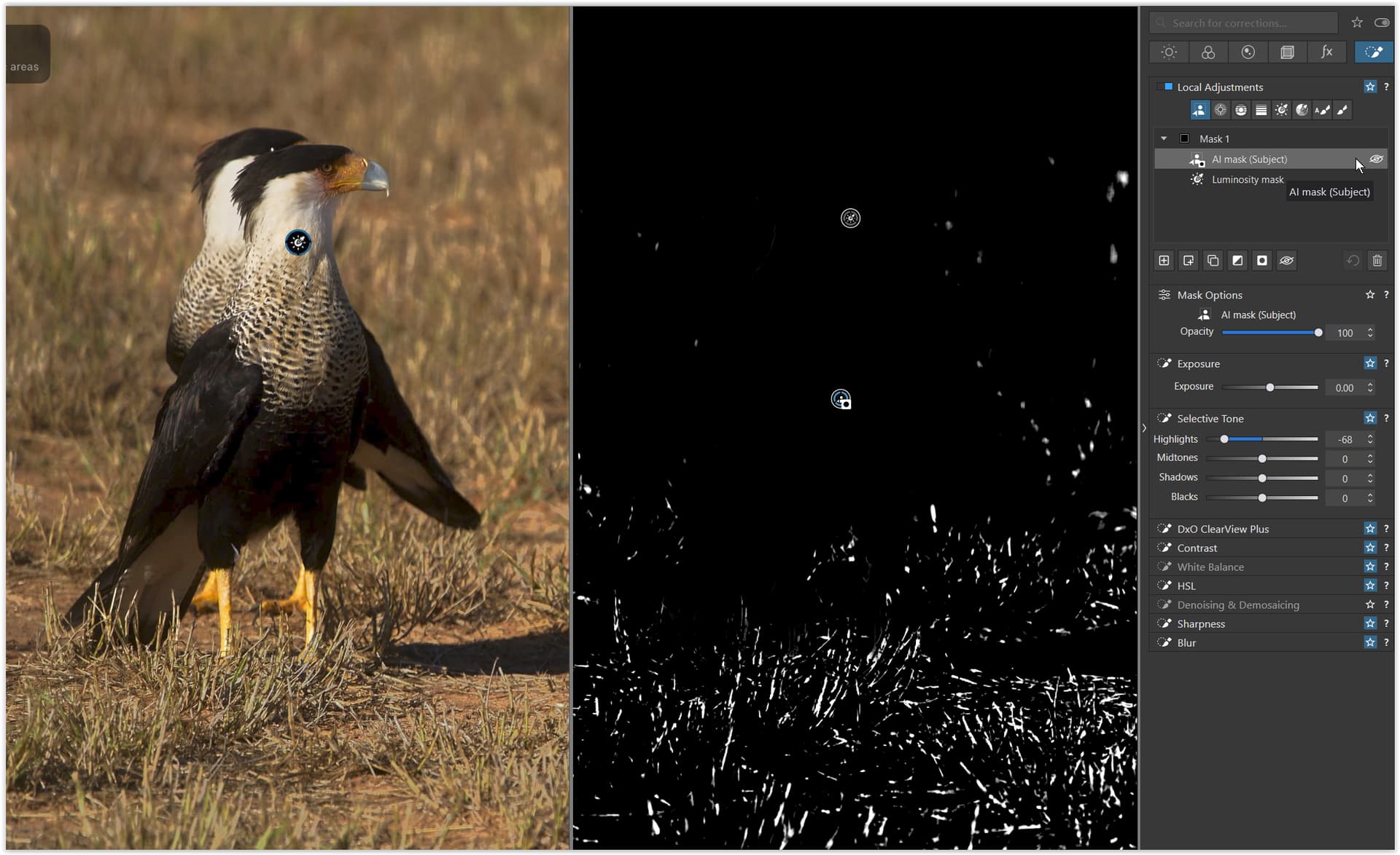 The example with bird is to interact with highlights of the bird but the way to achieve it in DxO is to interact with all the highlights in the image except everything but not bird or except background.