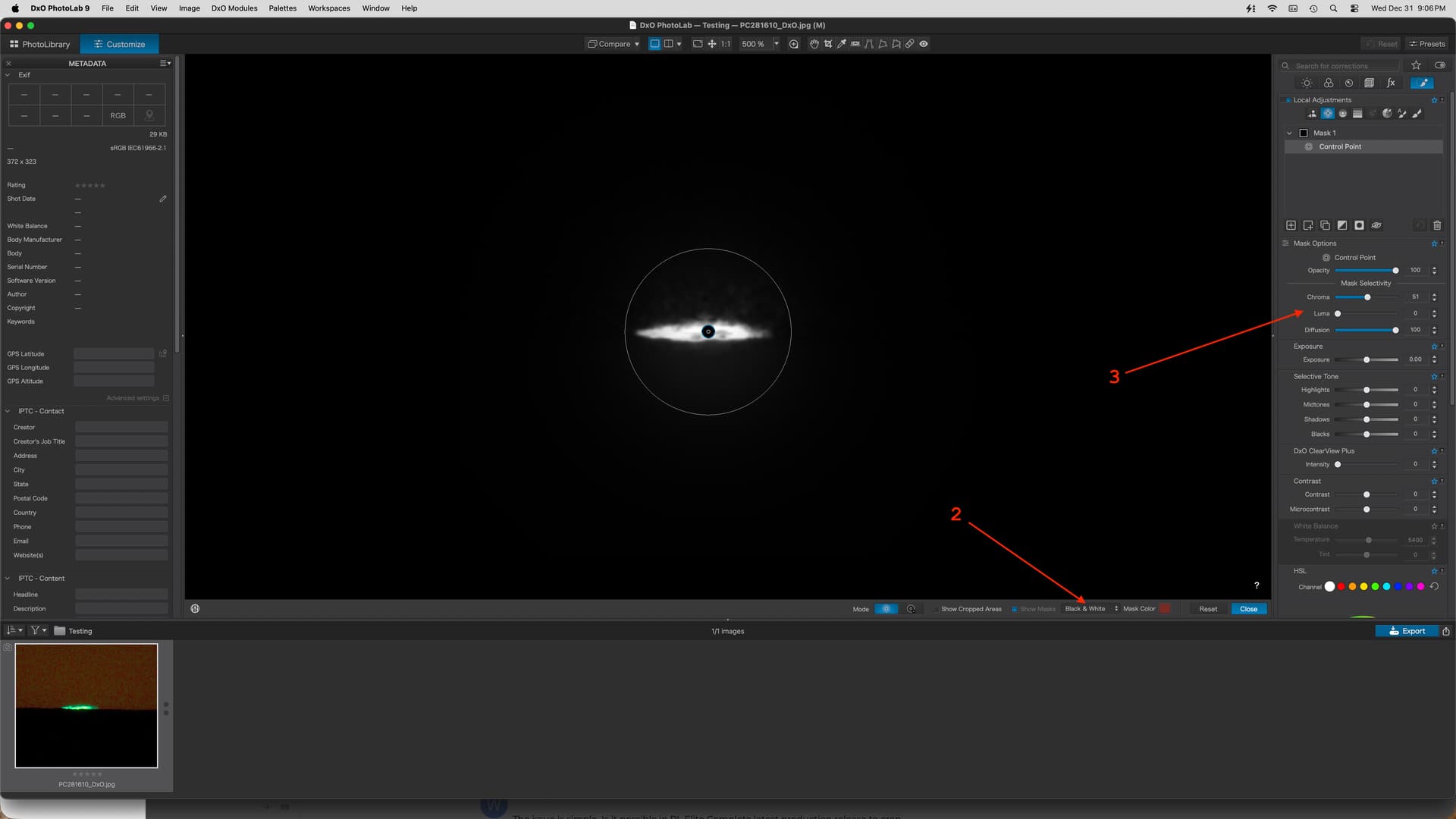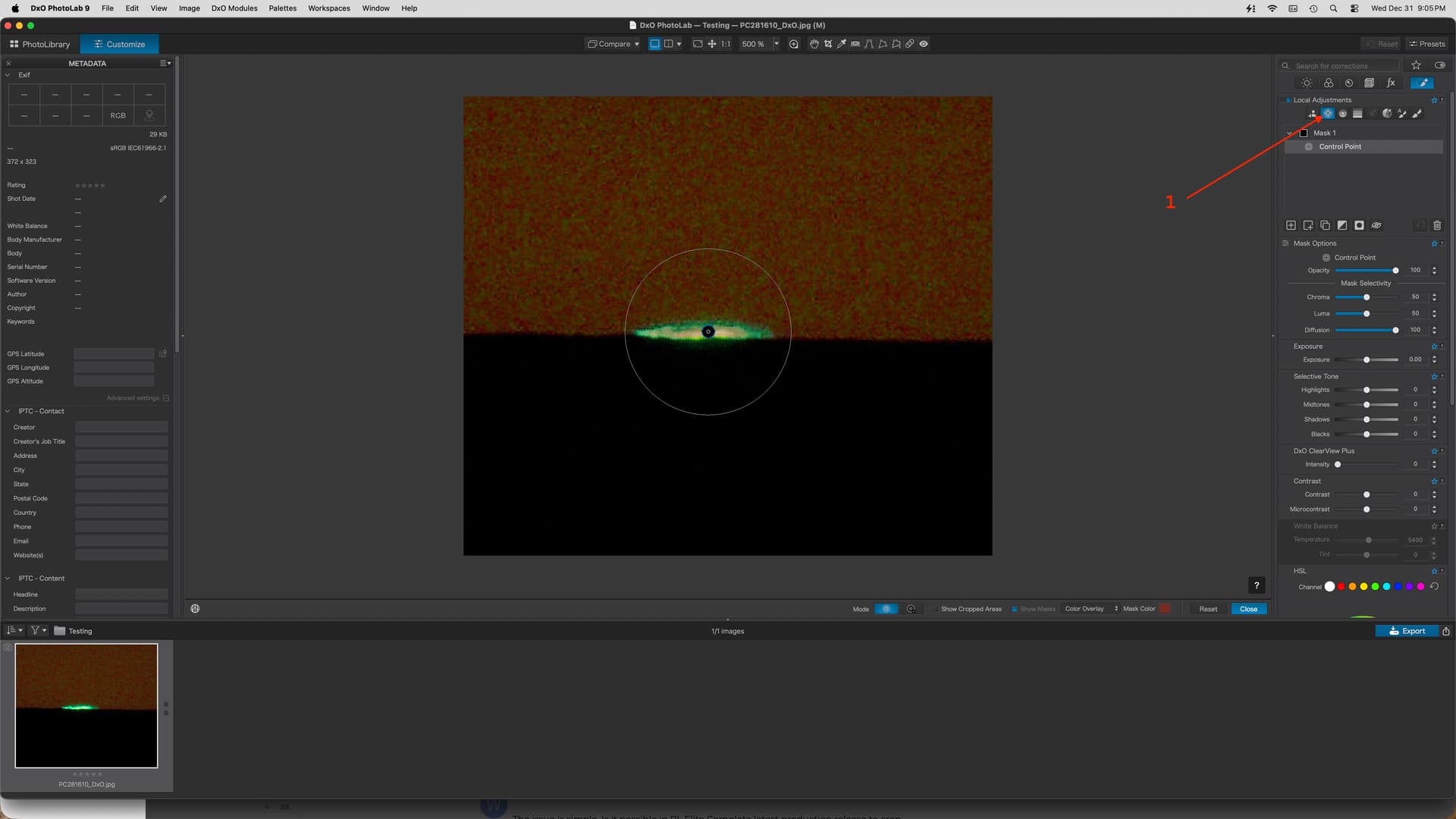 In PL9 Elite Complete, with the preview completed and the cropped image visible, how does one set control points for a mask? This did not seem to work for the cropped image. In this case, after correcting the green of the green flash, I would exclude that region of the cropped image from any further corrections, and then use the shadow, etc., sliders on the rest of the region to make it appear similar to what is seen by the eye at the actual event. If it is necessary to post the original (my copyright) ORF, please advise.