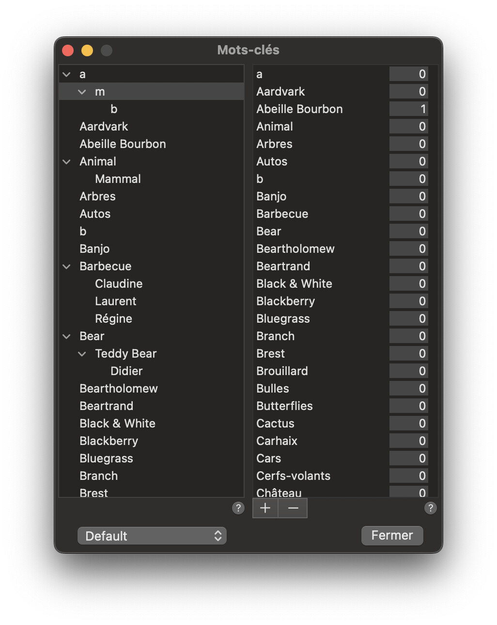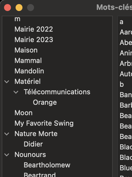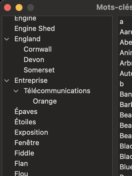Localisation issue: @StevenL: please check the keyword palette title. It’s in German, even though I set macOS to use English for DPL7. We’re in PhotoLibrary and I’ve not set any custom workspace. I think that I’ve already reported this. The issue is present in the RH dock only of the PhotoLibrary views in DPL versions 7, 6 and 5 and possibly before that. Didn’t check earlier versions though.