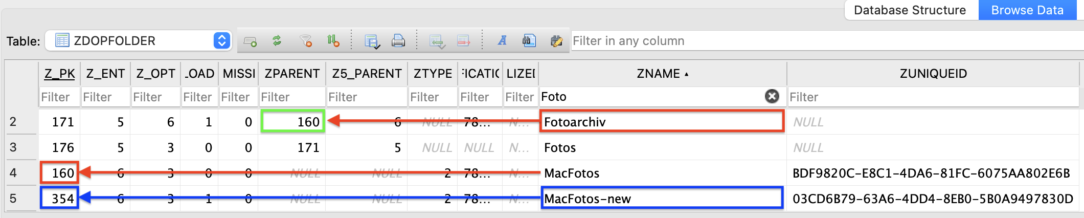 An item under ZNAME is for a volume, if there is a UUID. Without UUID, it’s a folder. Folders have parents (either a folder or a volume) and the parent’s primary key is found in column ZPARENT. Volumes have no parents.
