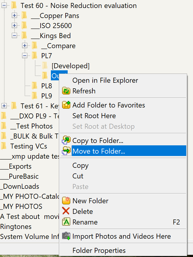 Add to the current mechanism which only allows “Drag & Drop”, please note that the destination must be visible onscreen i.e. PhotoLab(Win) does not automatically scroll the directories displayed when you get to the end of what is currently displayed! The extension needs to provide ‘Copy’ and ‘Paste’ or ‘Cut’ and ‘Paste’ menu items (commands) at the image level, preferably including the classic short cuts of ‘Ctrl-C’, ‘Ctrl-X’ and Ctrl-V’ (and whatever the Mac commands are).
