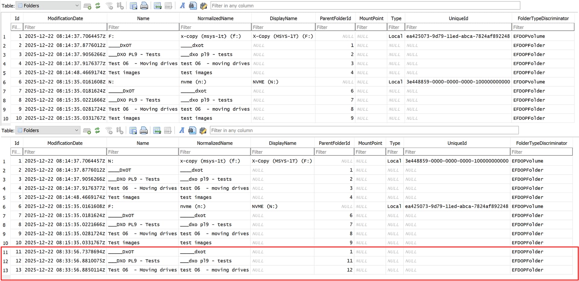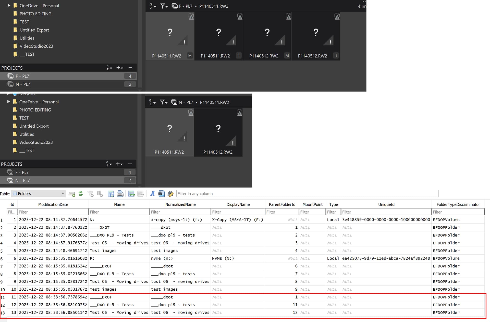 The test here was to simply demonstrate swapping two identical directories (almost identical, because one had VCs and the other didn’t), arguably what would happen if a user added a new drive and started some edits before realising that the discovered images and DOP edits were actually being added to the database as new entries.
