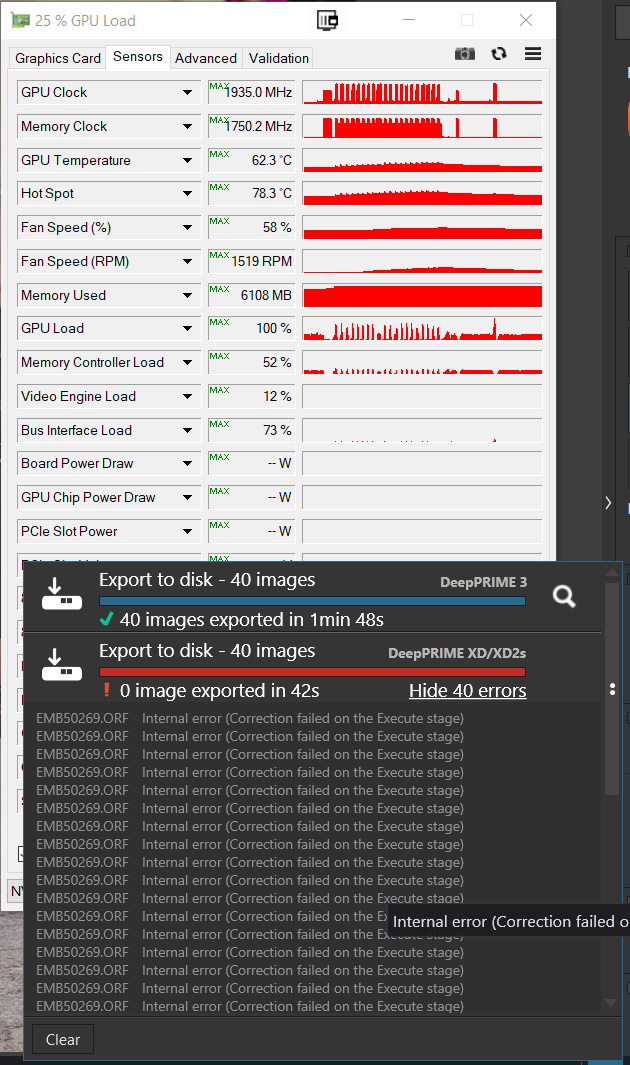 2025-10-15 10:59:56.097 | DxO.PhotoLab - 15756 - 27 | DxOCorrectionEngine - Error | Exception caught while calling ExecuteTileImage : Non-zero status code returned while running DmlFusedNode_0_9 node. Name:'DmlFusedNode_0_9' Status Message: D:\DATA\Bamboo\Builds\FWK-ONNXRUNTIMEPKG0-ORTPKG\ort_src\onnxruntime\core\providers\dml\DmlExecutionProvider\src\DmlGraphFusionHelper.cpp(1066)\onnxruntime.dll!00007FFD7743E8FA: (caller: 00007FFD774CE624) Exception(2) tid(4658) 887A0006 The GPU will not respond to more commands, most likely because of an invalid command passed by the calling application.