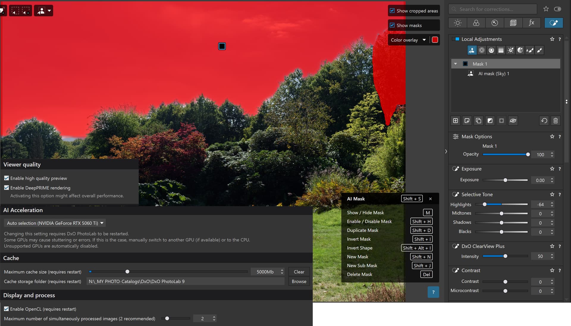 Note that there is a simple “Sky” preset selection and the highlights have been reduced and Clearview set to 50 so that I can visually see that the AI has been applied and to give the export process something to do with the AI selection.