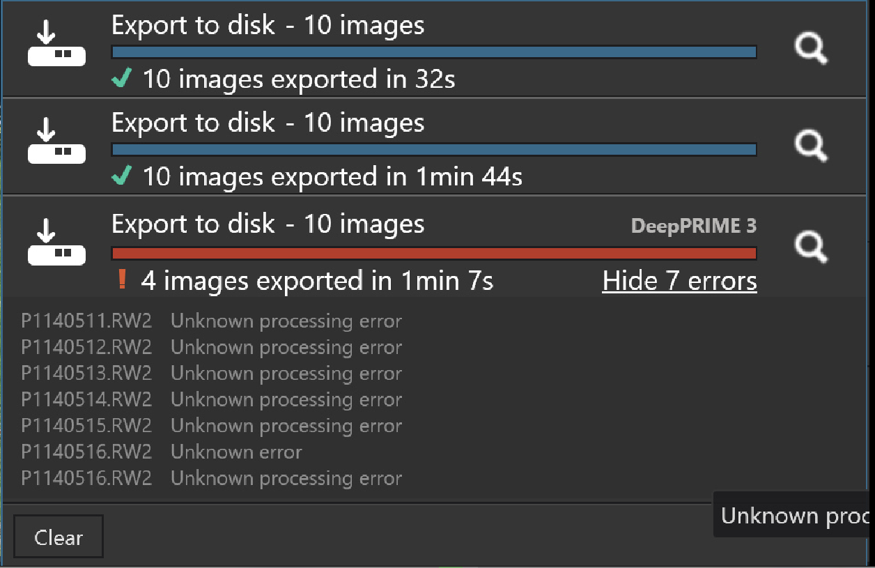 - Run an export run with all images set to NO NR (please check that is the case because in one of my tests it looked that way but they were actually still set to XD2s - the test failed anyway but …)