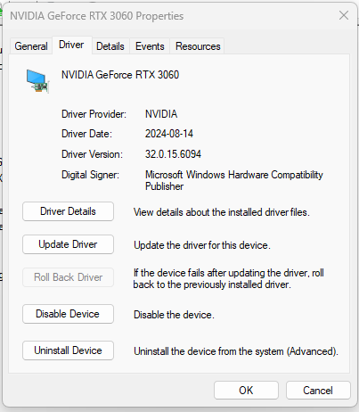32.0.15.6094 corresponds to 560.94 in another “version numbering space” (just read the last 5 digits and put a dot after third). It was released in August 2024 afaik. There was a later driver 566.36 (December 2024?) which is generally considered to be the most stable, at least on NVIDIA forums. It was released just before GeForce RTX 50 series went into market.