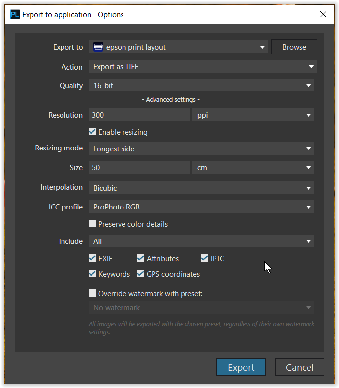 For those less familiar with and ask why this open with EPL nice: in LR/PS it has a plugin alike, you can choose in directly from the Export dropdown “Epson Print Layout”. Practically the same as this ‘Export to application’, but just put to the dropdown list without application browsing and so on.