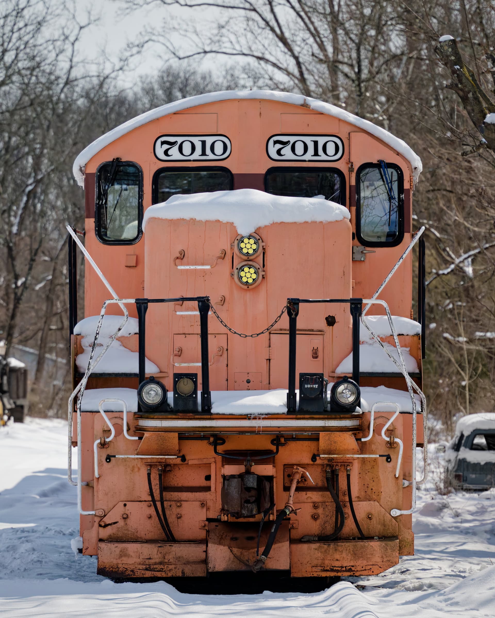 I spotted this local train engine draped in snow by a recent storm, and thought it nicely set off the peach color of the engine’s livery.