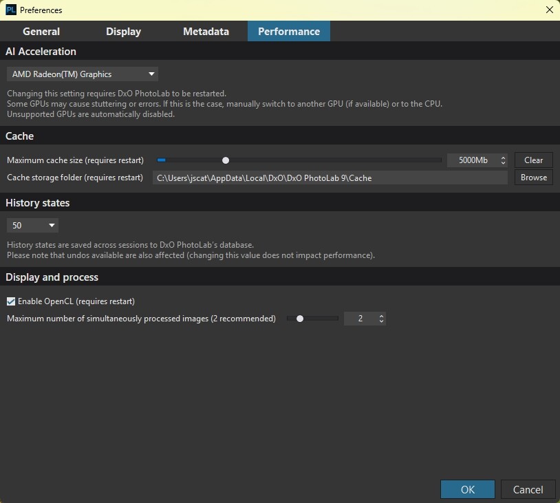 Recently, after reading part of the Photolab 9 user manual, I decided to change the AI acceleration from Auto(CPU), to "AMD Radeon™ Graphics), as well as setting OpenCL to On. Attached is a screenshot of my exact performance configuration.