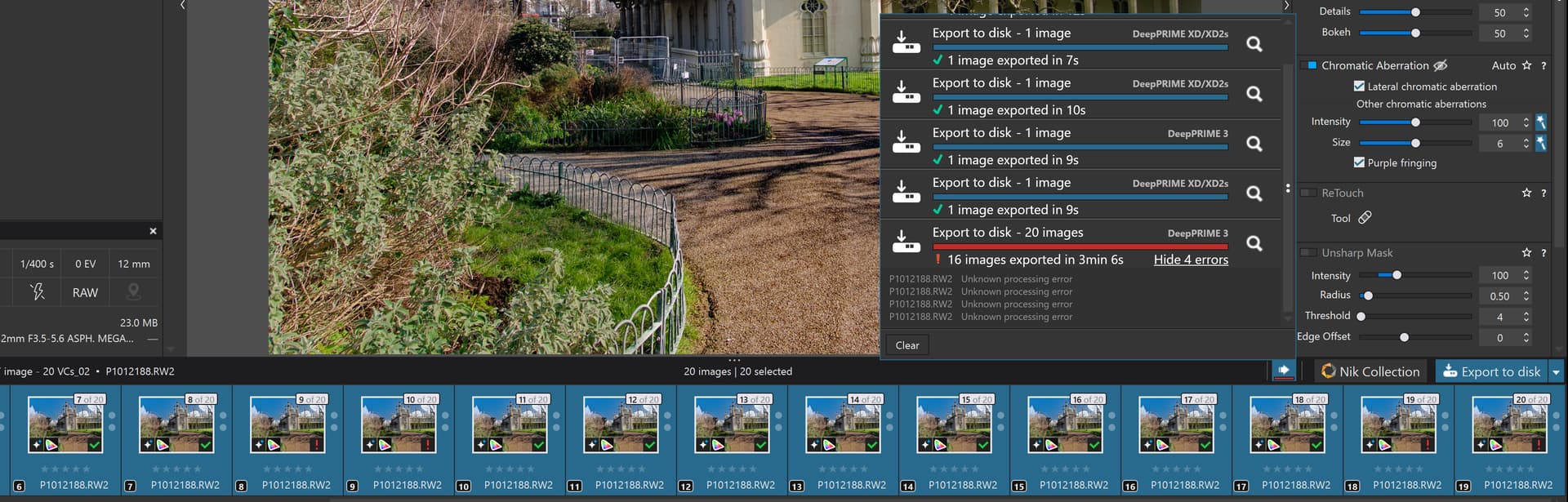 When I run a series of tests changing between DP3 and XD2s PL9 almost always falls over with the first two images getting an export error but today after some simple exports changing between the two NR algorithms I ran a test with my âfavouriteâ image of Brighton Pavilion and now I get 4 and in different places !!?