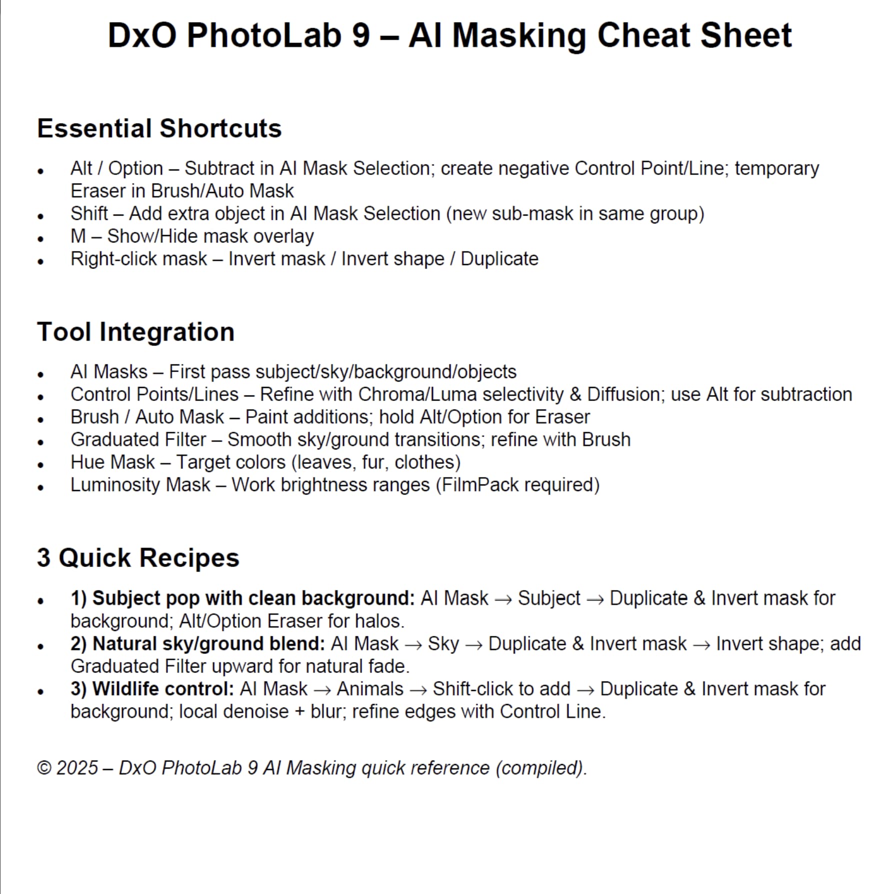 - Brush / Auto Mask: hold Alt/Option to temporarily switch to Eraser (clean up edges fast). DxO Forum