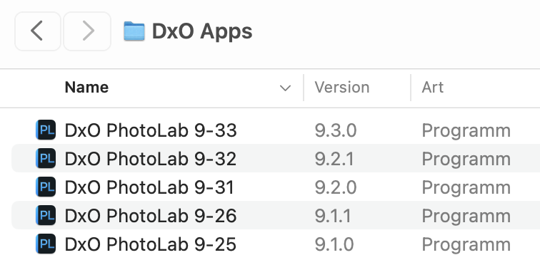 Occasionally, renaming the app can remove the version numbers shown above. Better rename the app in the “Information” window (command-I) because internal and visible names can be quite different. As you can see, I put the apps in a separate folder in order to not fill the /Applications folder with umpty versions of PhotoLab.