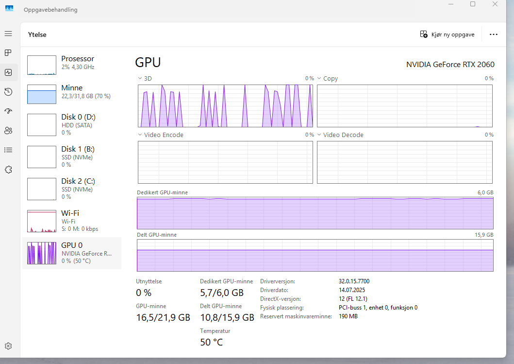 After a second restart, it actually works better. I have now successfully exported three photos. Still, I’m worried about the memory use; it looks like it’s getting slower for each photo exported. For the first photo it stays inside GPU memory; after that, it starts using shared memory, more for each export. After number three is finished, it looks like this: