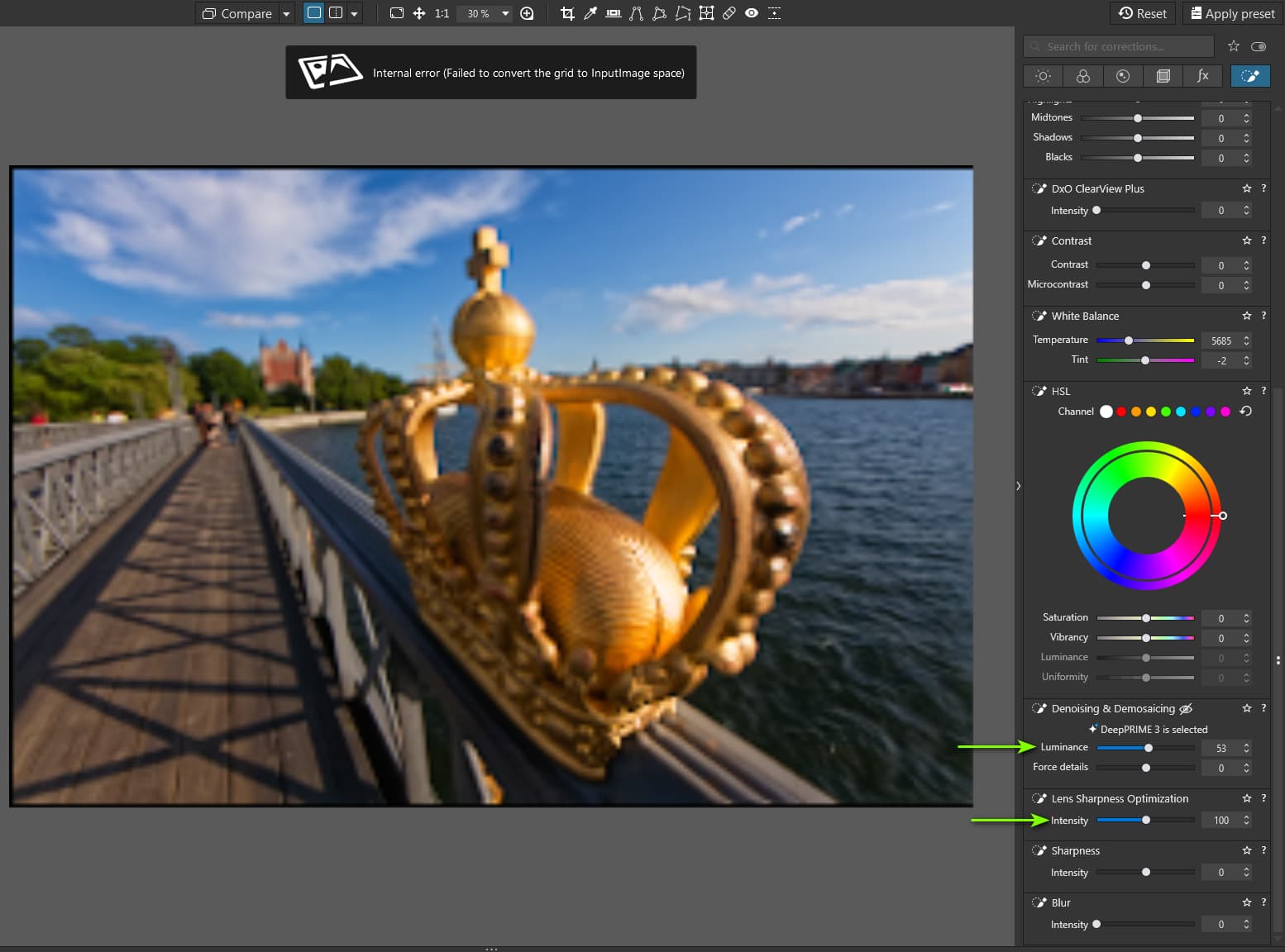 Today, I encountered the same error as in the screenshot - “Failed to convert grid to inputimage space”. It’s caused by using Reshape Fusion to slightly improve the building in background, with Deep Prime reduction selected (XD also shows the same error), then using any mask (not just AI!) and attempting to adjust the “Luminance” and/or “Lens Sharpness Intensity” sliders. Using the other sliders, including “Force Details,” doesn’t cause this error. The good news is that it doesn’t crash the program; simply reset both sliders to their default values.