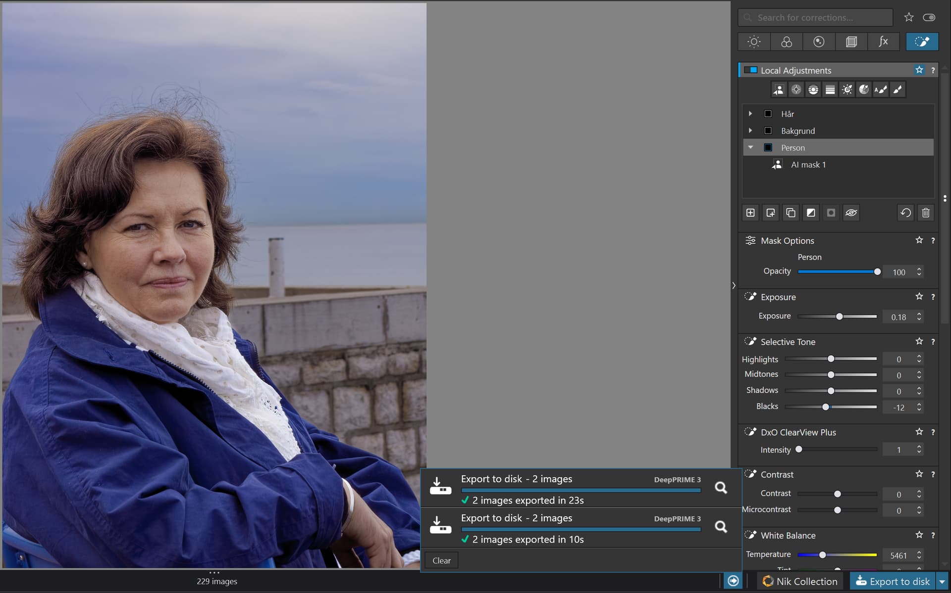 The last thing I did was to restart both Windows and Photolab to clear all caching. Still the export of this picture, which is an old NEX 7 24 Mp RAW-picture, took 3 seconds with Deep Prime 3 activated. So, for me it absolutely looks like Deep Prime 3 is a little faster than Deep Prime XD2s. For the record it is also quite a lot of adjustments done to this picture even before the masking was done in the first example. In the later ones only the masks were deleted.