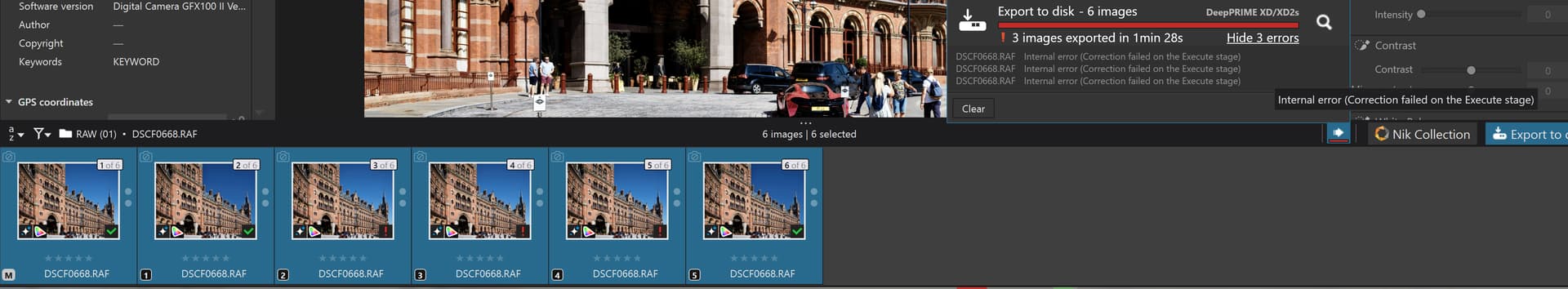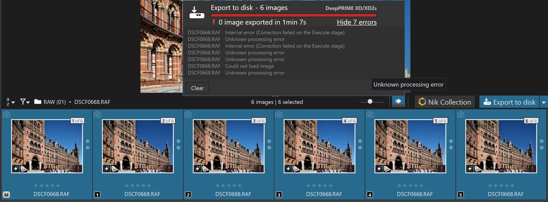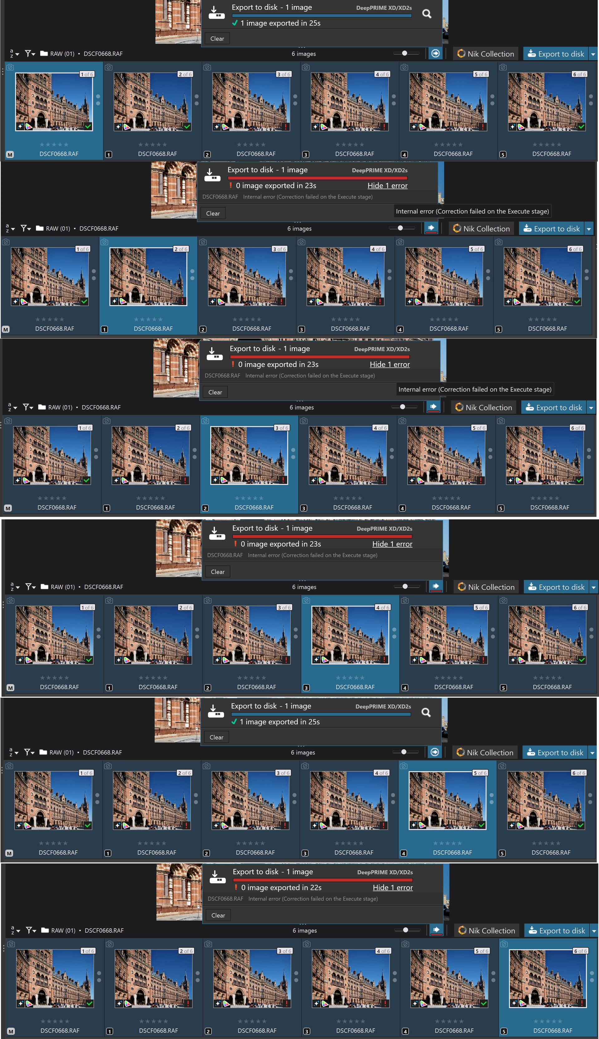 So, yesterday straight from a restart I selected all 6 images and exported them and was pleasantly surprised (shocked to be honest) when exports other than just the [M]aster actually succeeded, particularity VC[5], as shown below !?