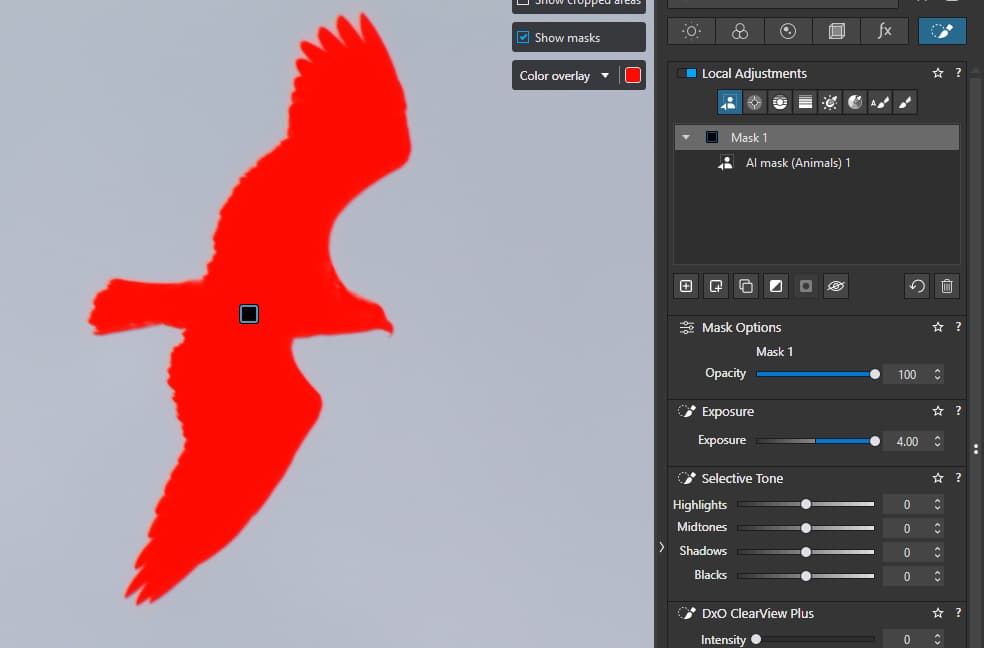 I’m not using ai masks (because they don’t work for me - bird not recognised. The images I posted were just original image + dxo optical corrections, then a boost to exposure.