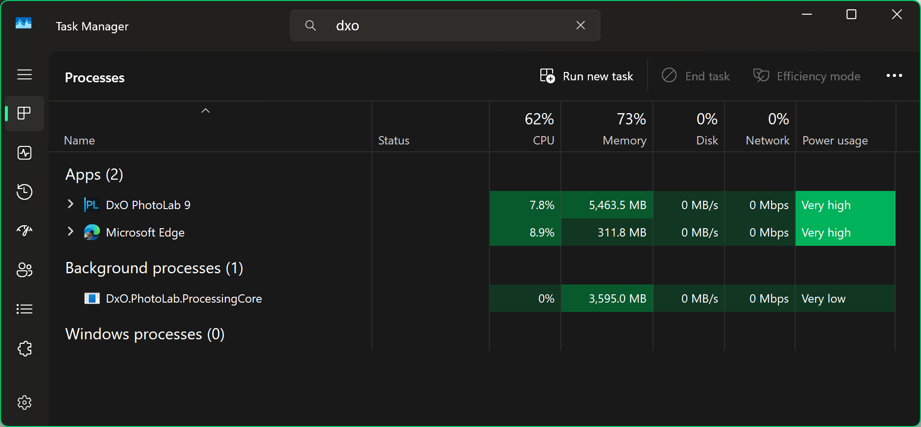 (In Windows 11 25H2 (but maybe also earlier) there’s a search option at the top of task manager’s app list. Putting DXO in there found them easily.)