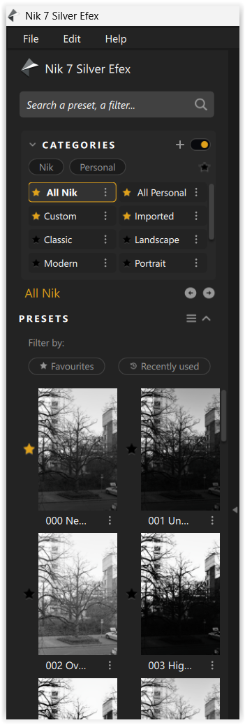 Silver Efex Pro – Option to enlarge preset thumbnails or switch to single-column preset list