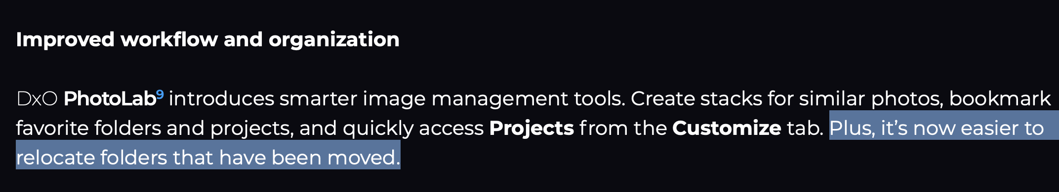 In DxO PhotoLab 9, when a folder has been moved outside of PhotoLab (for example, using Finder), the software will mark it as missing in the database.